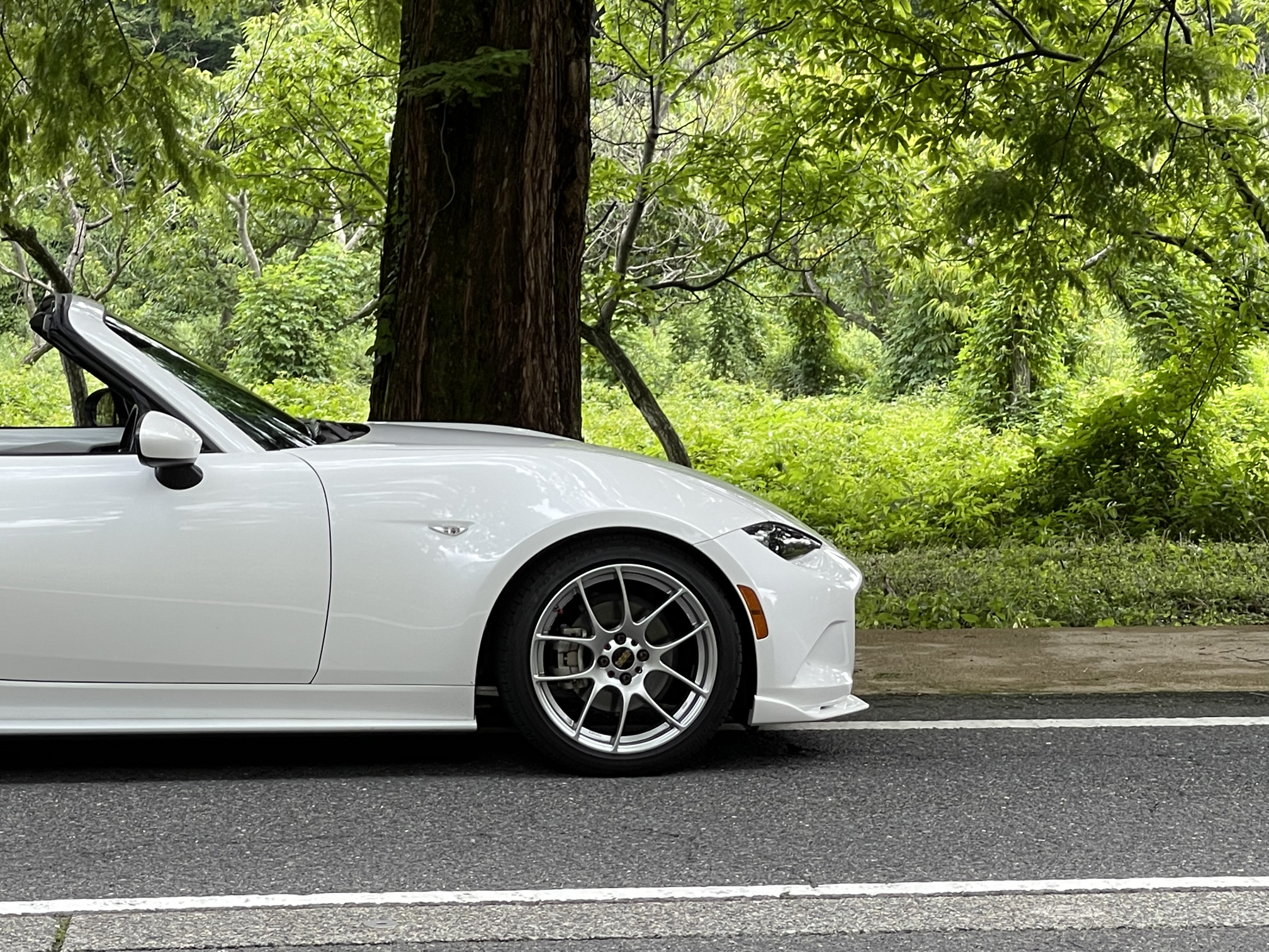 メタセコイヤ並木の元でホイールが映えるように撮りました。もちろんロードスターも。