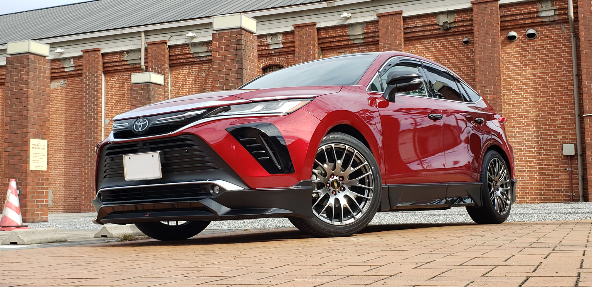 センシュアルレッドのハリアーにベストマッチしています。レトロな風景をバックに、目を引くのはやはりBBS。見る者を釘付けにします。