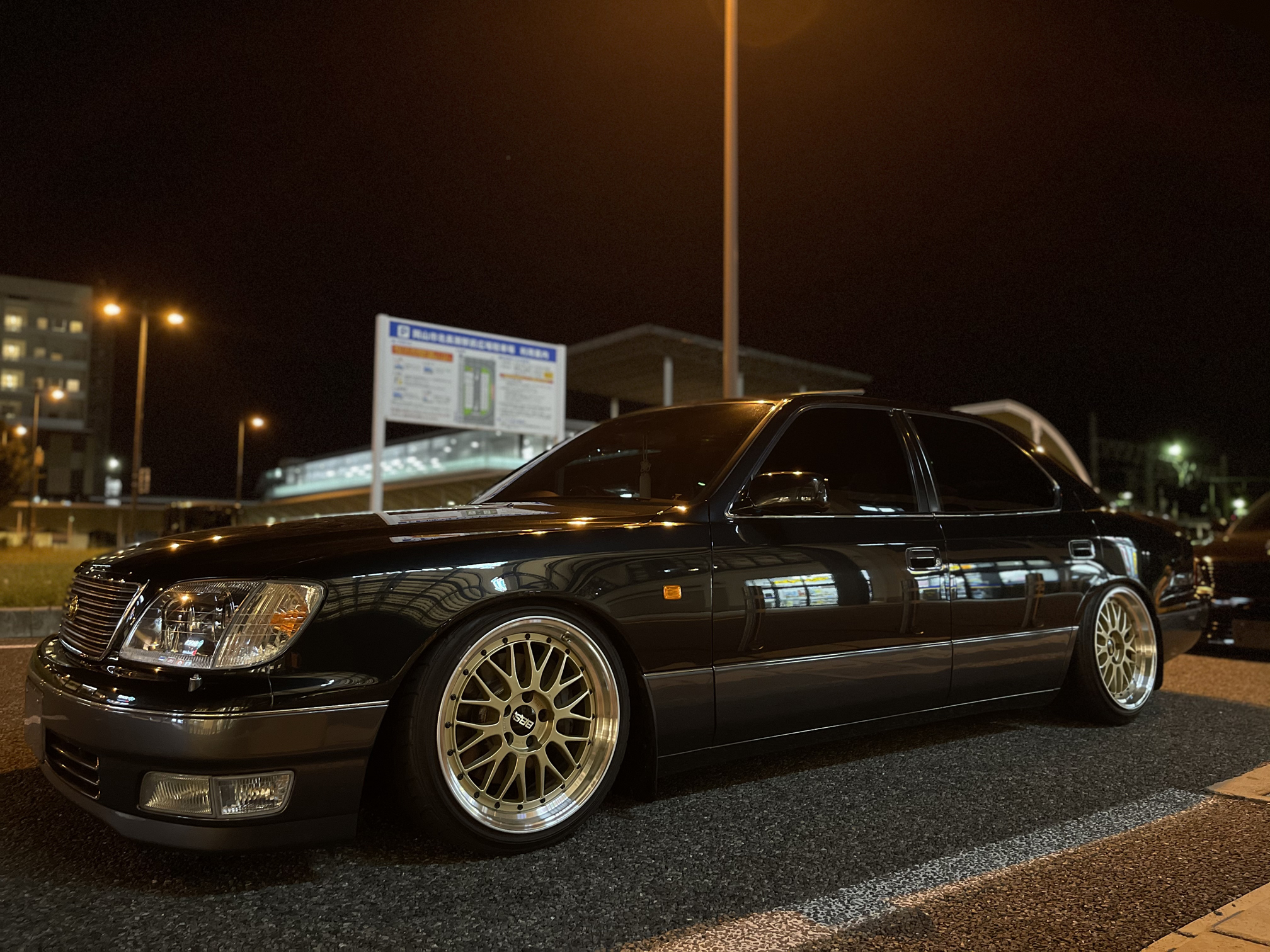 駅前で撮った写真になります。LMゴールドの良さは夜にもあると思っています。夜にしか見せない光と影が作り出すゴージャス感。本物であるからこそ惚れ込む事のできるホイール。レーシーなイメージなホイールでも、高級感漂うセルシオに、このホイールが馴染むのです。