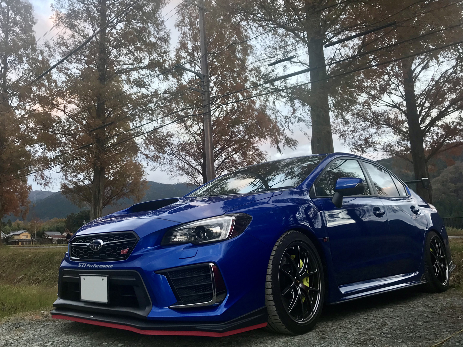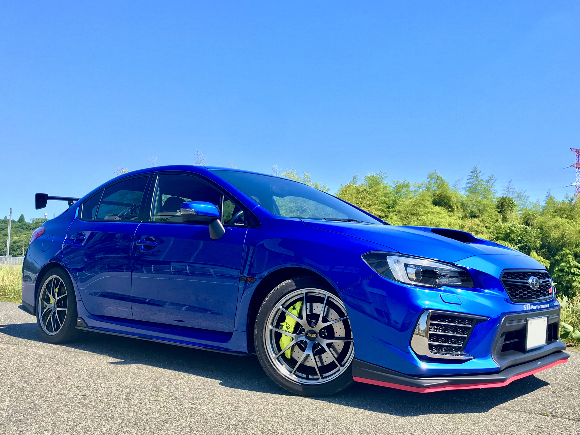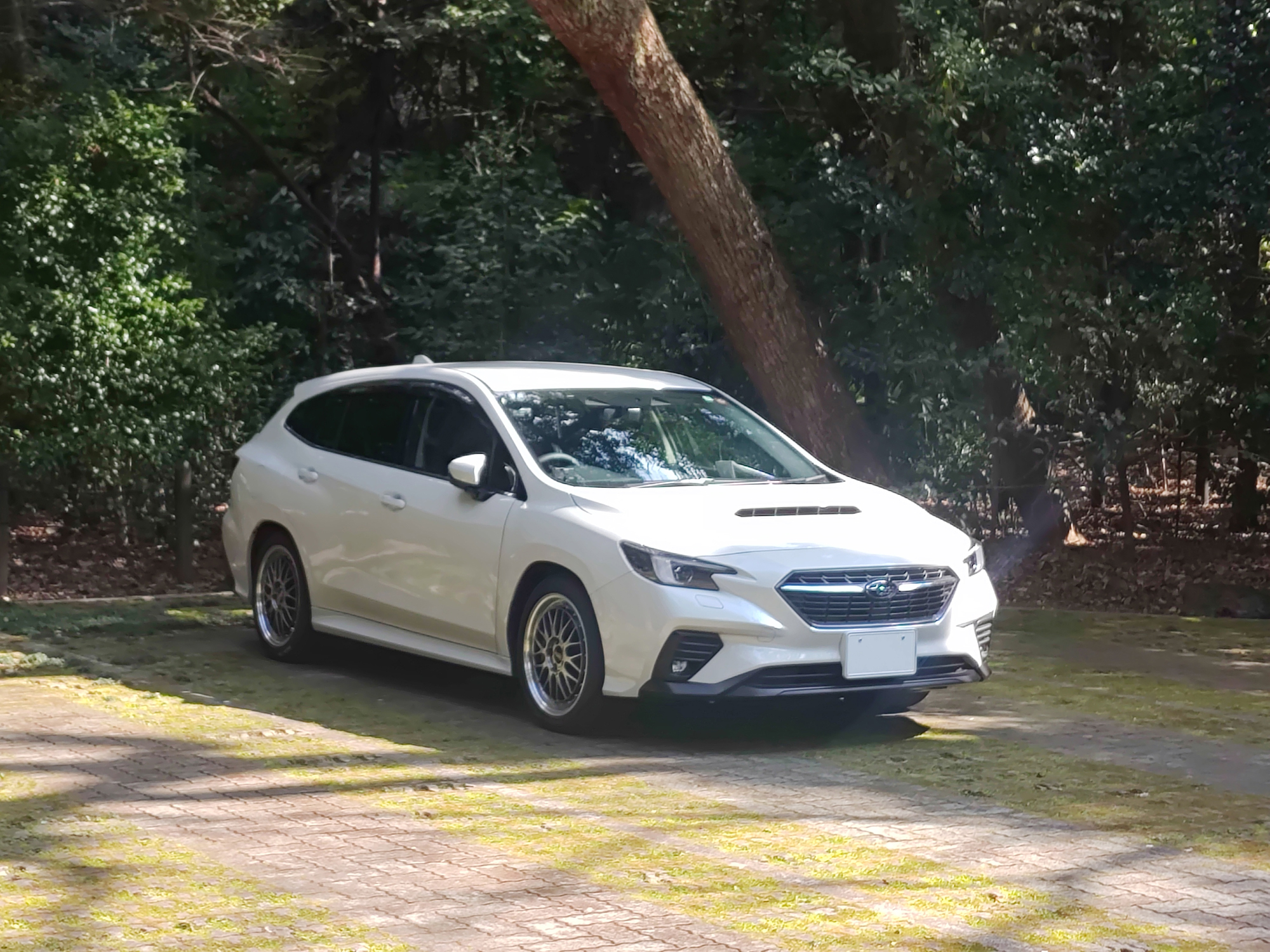 静岡県、伊豆市の大瀬海水浴場にて撮影。青い海に白いスバルの車体、そして鍛造ホイールがよく映える一枚。