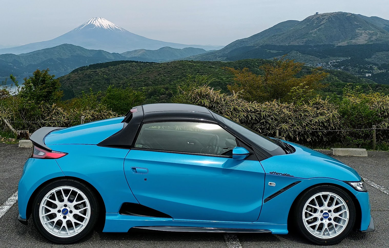 新緑の箱根に入った時に富士山と同じ色合いの青い車と白いホイールで撮ってみました。